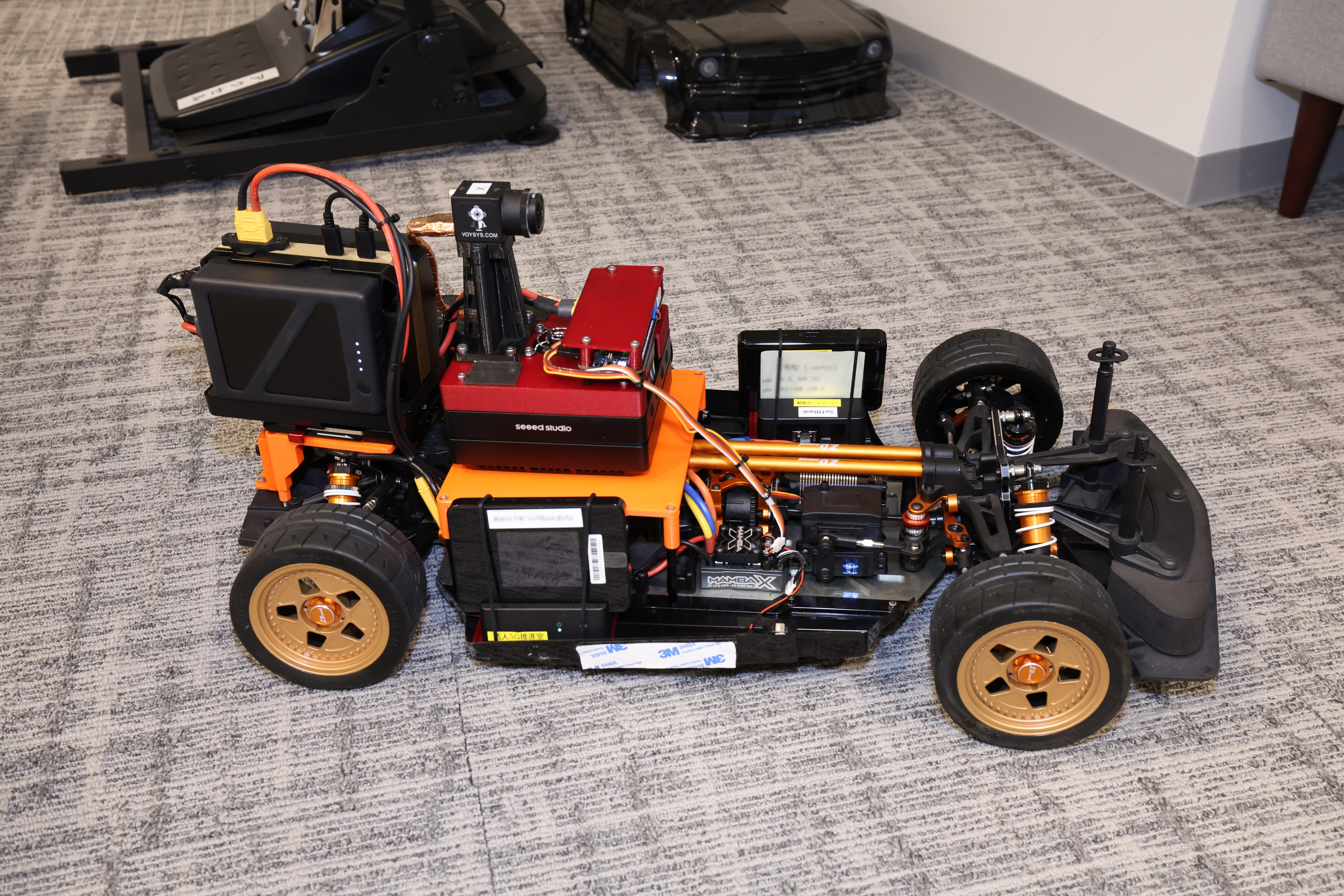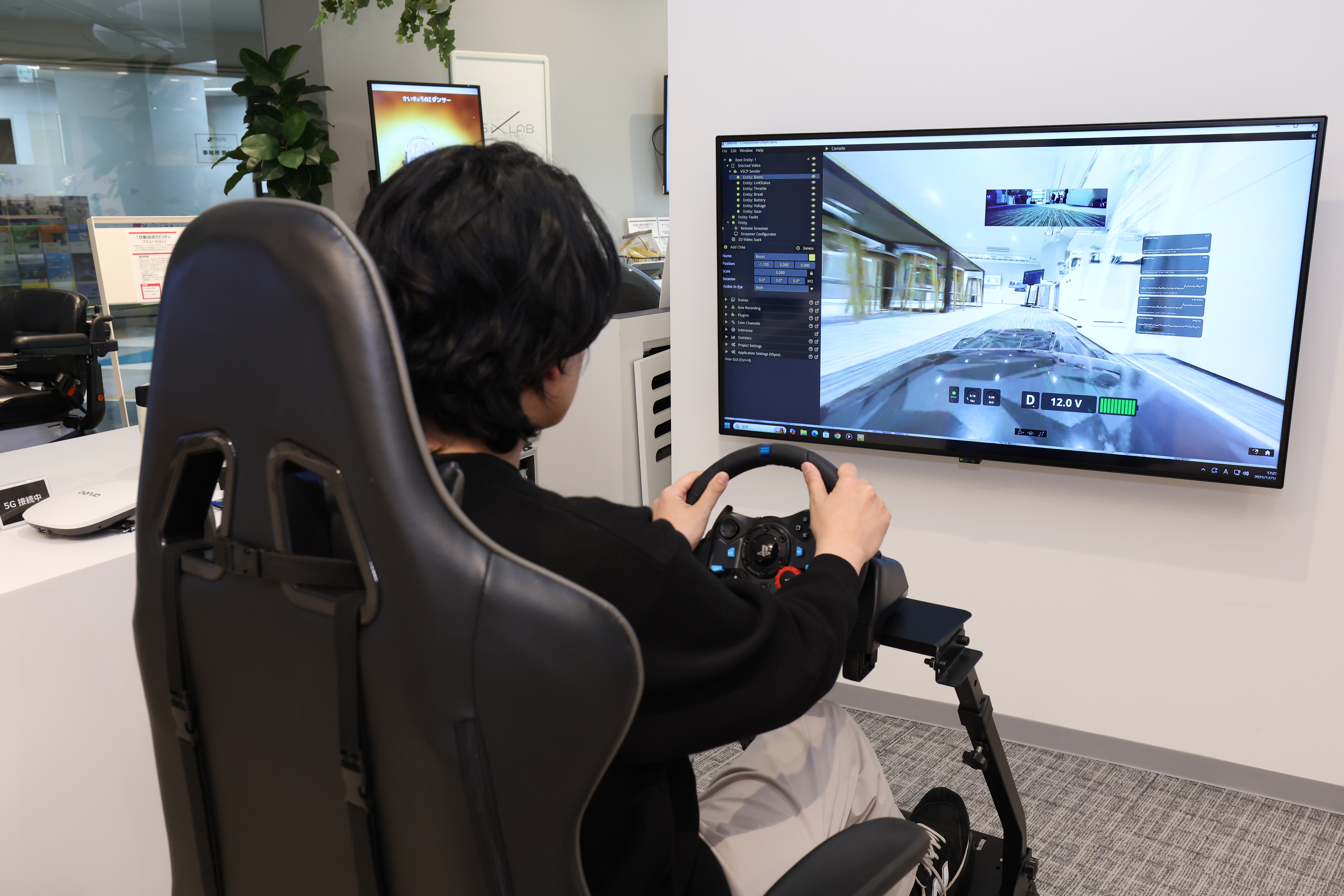 「遠隔操縦体験システム(Voysys)」は、カメラを装備したラジコンカーからの映像を大型モニターで見ながら遠隔運転のデモンストレーションを体験できるプロダクトです。運転席に座ると、ラボ内に駐車されたラジコンカーから見える世界が目の前に広がり、ペダルを踏めばラボ内をラジコンカーで自由にドライブできます。視界となる映像はネットワークを経由して大型モニターへ配信され、運転者のペダルやハンドル操作もネットワーク経由で情報が送信されています。