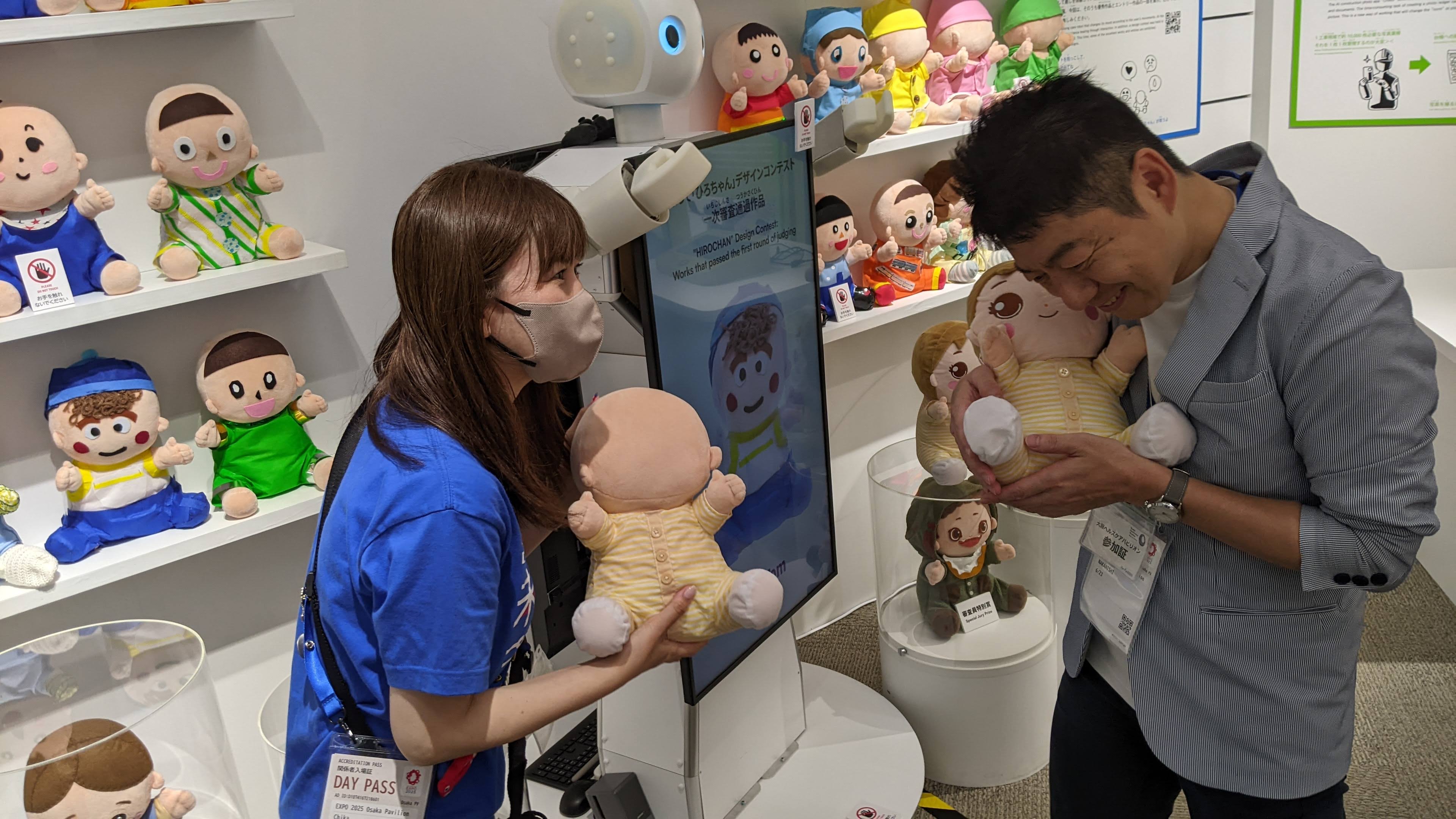 可愛らしい赤ちゃんのような人形ロボット『かまって ひろちゃん』が並べられていたのはヴイストン株式会社のブース。『かまって ひろちゃん』は加速度センサーとスピーカーを搭載し、利用者が赤ちゃんをあやす揺り籠のような動作をすることで、無邪気な笑い声を出してくれる癒し系の介護ロボットです。女性スタッフの方曰く、期間中は小さいお子さんからシニアまで、さまざまな年代の来場者が体験してくれたようで、中でも御年配者の女性は「子どもや孫のことを思い出すわ」と、なんとも言えない笑顔で話してくれたそうです。