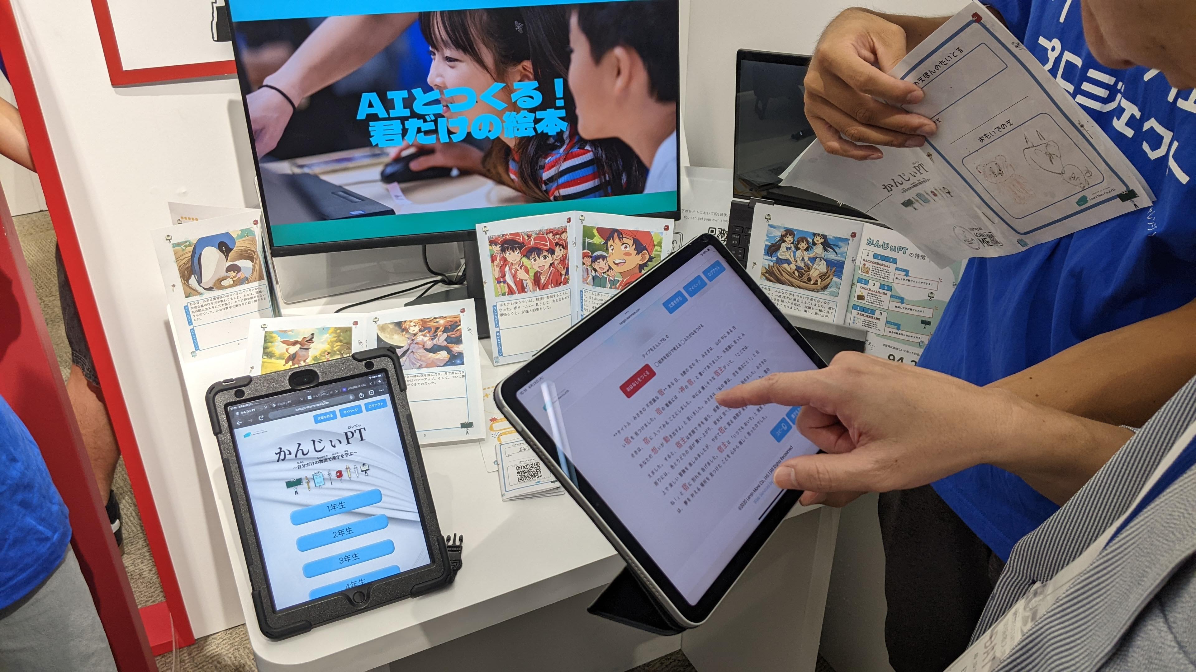 「リボーンチャレンジ」エリアで、子どもたちの列が途切れなかったのが、株式会社LearnMoreの「かんじぃPT」。子どもたちが選んだ漢字を使って、AIが創作の物語を作ってくれる漢字学習アプリで、タブレット端末で楽しそうに漢字を選ぶ子どもたちの姿が見られました。子どもたちが選んだ漢字で制作された物語を絵本にして、後日プレゼントする予定で、300名近くの申込があったそうです。代表取締役社長の坂口雄哉氏からは、「万博に向けてJLPTの日本語能力試験に対応したバージョンを組み込んだところ、日本語を勉強中の外国人の方から『こんなサービスが欲しかった!』と、とても喜んでいただけました」とのお話も聞けました。