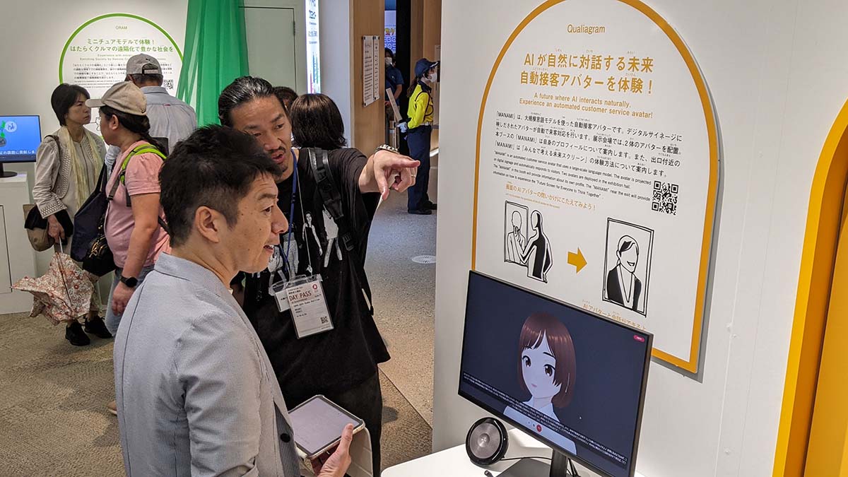 「リボーンチャレンジ」エリアの入口すぐに設置されていたのが、株式会社Qualiagramの開発したAI接客サービスの「MANAMI」です。大規模言語モデルを使った自動接客システムで、デジタルサイネージに映ったAIアバターの「MANAMI」が、「リボーンチャレンジ」での展示内容を説明していました。来場者の質問をマイクで拾い、AIが的確な回答を選択し、「MANAMI」が声と文字(テロップ)で返答。その返答精度の高さに記者の私だけでなく、多くのお客さんが驚いていました。スタッフのお話では、特にシニア世代が興味深く話しかけることに手応えを感じたとのこと。「パソコンやスマホの文字入力が難しいシニア世代の多い限界集落などでも、このAIアバターをコミュニケーションアプリと連動させて、声だけで問合せができる仕組みを考えています」と話されていました。万博での展示において、プロジェクトが進むきっかけを掴んだようです。