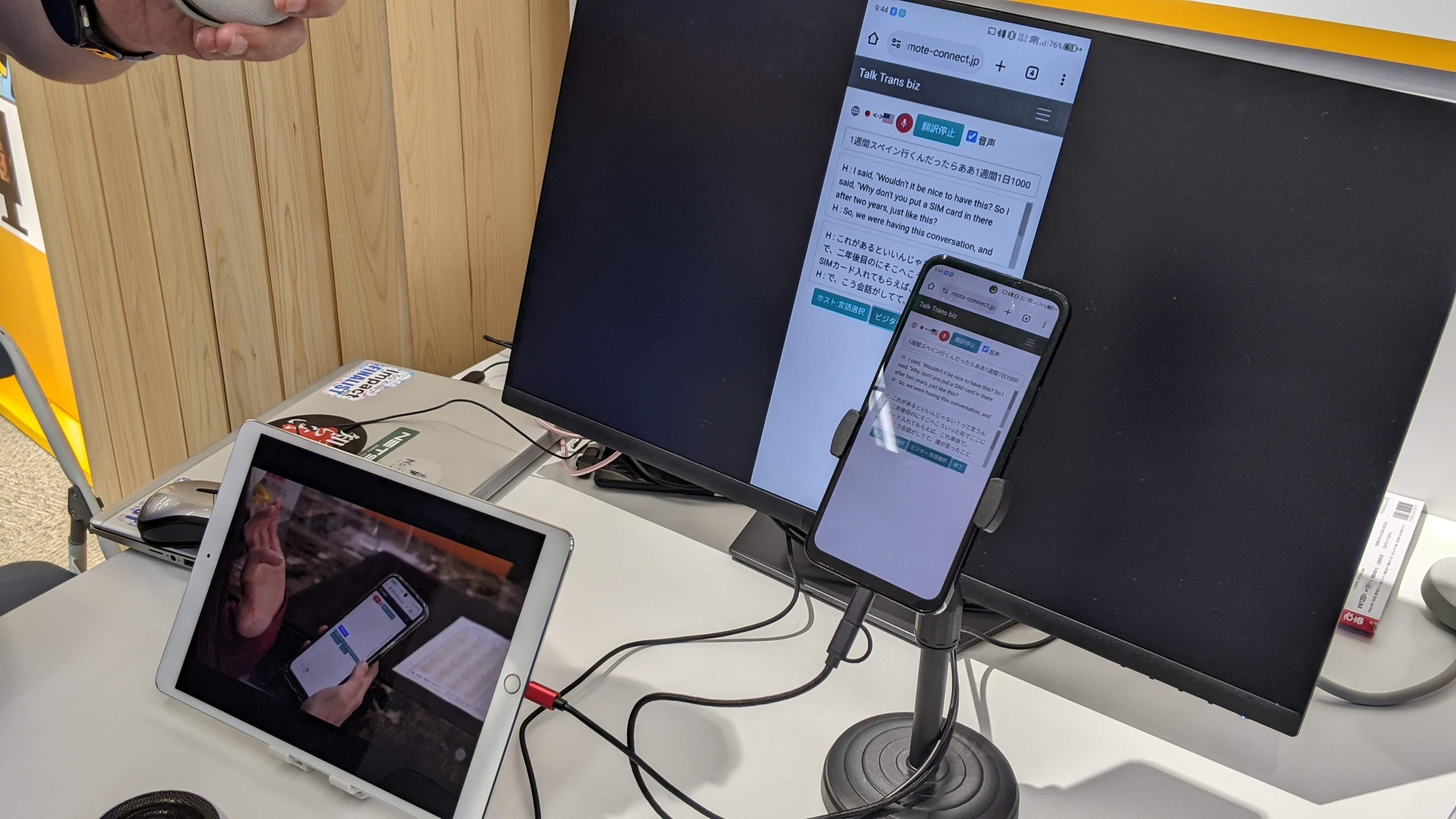 MANAMIの隣では、株式会社C&Tの開発した全自動型対面AI通訳の「Talk-Trans」が体験できました。医療系の研究者でもある同社の代表取締役の瀧澤清美氏が開発した「Talk-Trans」の特徴は、ハンズフリーでシームレスに翻訳機能が使えることです。話し終わるたびに翻訳ボタンなどを押す必要がなく、一度設定して、お互いにそれぞれの言語で話せば、AIが自動認識して相手の言語に翻訳してくれます。外国からの来場者が多い万博会場でこそ、大いに真価を発揮できるサービスだけに、外国人にも興味を持たれていて、実際に「Talk-Trans」を使って、会話と笑顔が溢れる場面も見られました。